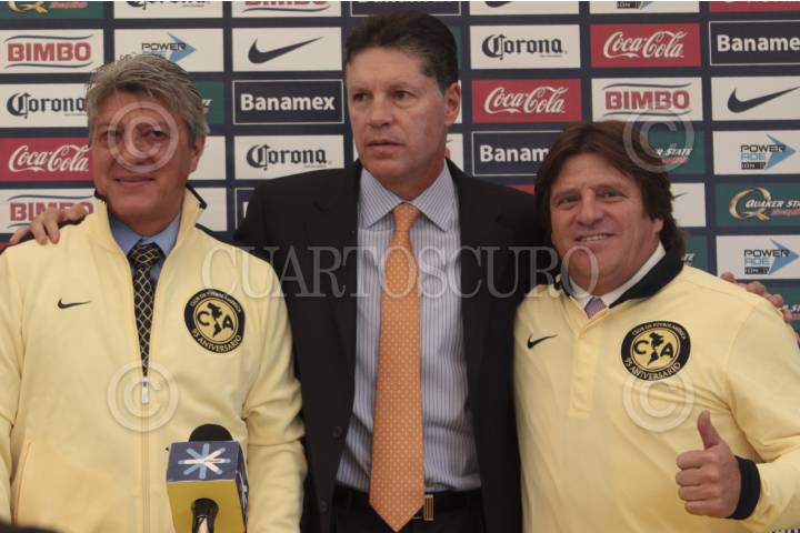 MÉXICO, D.F., 16NOVIEMBRE2011.- Jesús Ramírez, nuevo encargado de las fuerzas básicas del América junto a Ricardo Pelaez Presidente del América y Miguel el "Piojo" Herrera durante la presentacion delos nuevos directores de las Águilas. FOTO: ENRIQUE ORDÓÑEZ/CUARTOSCURO.COM