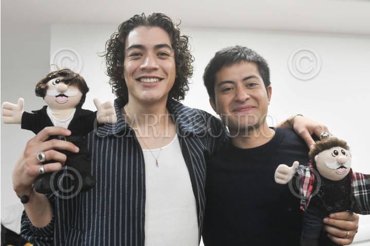 CIUDAD DE MÉXICO, 29JULIO2025.- Los cantautores Matías Gruener, y Dany Dstance, muestran "Dr. Simi" personalizados, al final de la presentación y entrega de la letra del tema "Semillas de vida" para la "Fundación Simplaneta" realizada en las instalaciones del Corporativo Grupo por un País Mejor. FOTO: MARIO JASSO/CUARTOSCURO.COM