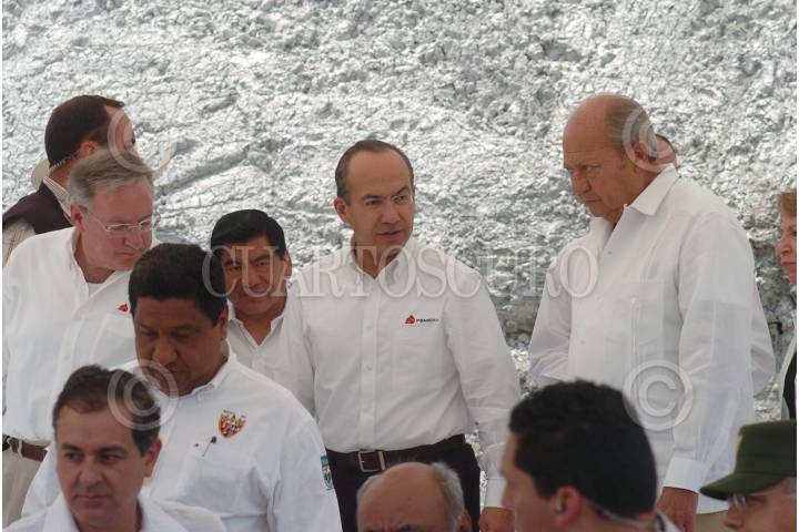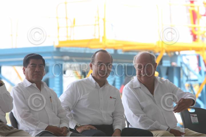 VENUSTIANO CARRANZA, PUEBLA, 18DEMARZO2009.- El gobernador de Puebla Mario Marín, Felipe Calderon Hinojosa, presidente de México y Carlos Romero de Champs, Secretario General del Sindicato de PEMEX. durante la ceremonia de conmemoración del 71 aniversario de la expropiación petrolera FOTO: ALFREDO GUERRERO/CUARTOSCURO.COM