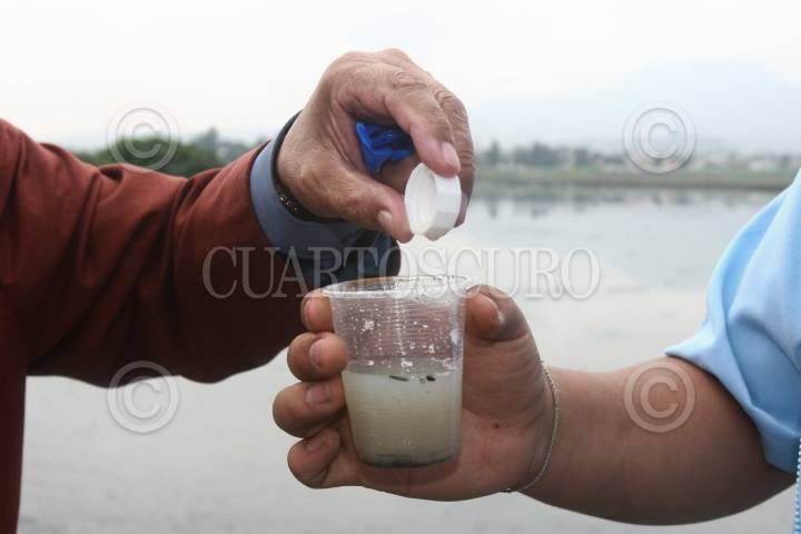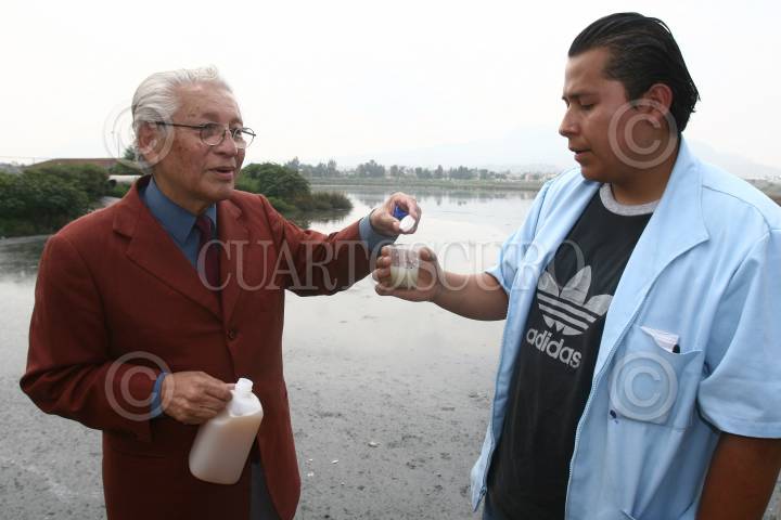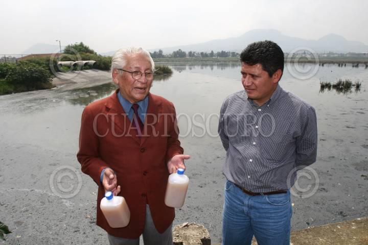 MÉXICO, D.F., 11SEPTIEMBRE2009.- Hector Penagos Gonzalez, investigador y cientifico junto con el diputado Manuel Salazar acudieron al vaso regulador de el Salado donde dieron una demostracion para potabilizar aguas negras con una sustancia a base de acidos grasos polinsaturados derivados de productos naturales como soya, miel de abeja, pino y carcamo. FOTO: SAÚL LÓPEZ/CUARTOSCURO.COM