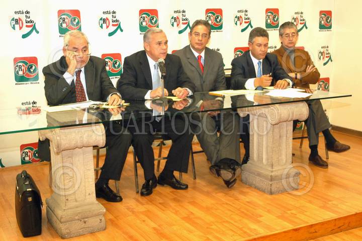 MÉXICO, D.F., 06SEPTIEMBRE2006.- En la sala de prensa del PRI Nacional, conferencia de Carlos Jiménez, José Aguilar Bodegas, Carlos Flores Rico, David Penchina y Cesar Augusto Santiago para anunciar que el CEN del PRI promovera una acción jurídica, civil y penal contra las autoridades del IFE en Chiapas y del gobernador Pablo Salazar Mendicuchía por la pasada elección de estado. FOTO: FRANCISCO MARTÍNEZ/CUARTOSCURO