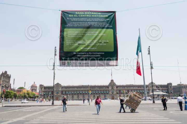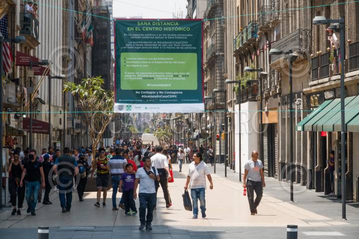 Autoridades sanitaria piden sana distancia en las calles del Centro Histórico con pendones informativos