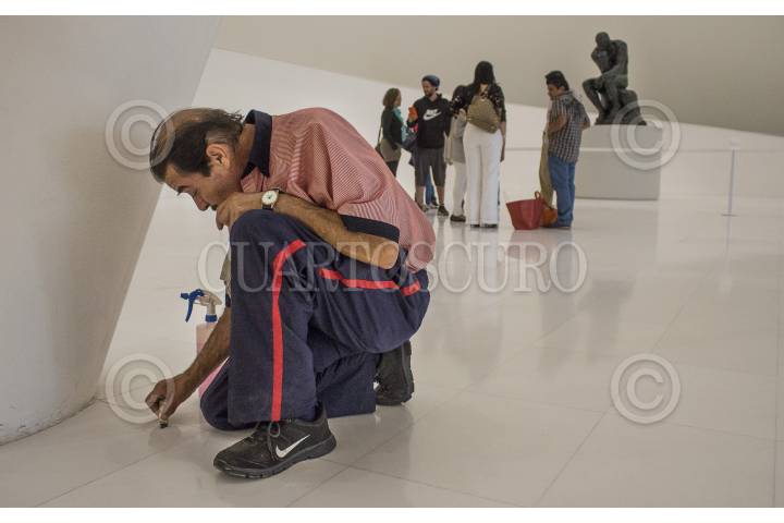 MEXICO, D.F., 05DICIEMBRE2015.- Un empleado de limpieza en el museo Soumaya se encarga de cuidar que el piso blanco no se manche. Al fondo, visitantes al museo contemplan "El Pensador" de Rodin. FOTO: DAVID POLO/ CUARTOSCURO.COM