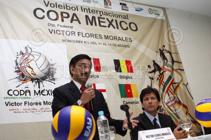 MÉXICO, D.F., 19JULIO2011.- El diputado Victor Flores; Jesus Perales Navarro, presidente de la Asociación de Voleibol de Nuevo León y director del evento; Rafael Anaya, secretario general de la Federación Mexicana de Voleibol; Juan Carlos Vargas, director de la OCV Monterrey y Carlos Mercenario, asesor de alto rendimiento de la CONADE; durante la presentación del evento "Copa México: Diputado Federal Víctor Flores Morales" que se realizará en la ciudad de Monterrey del 11 al 14 de agosto de 2011 y que contará con 4 equipos en la rama varonil como son Bélgica, Inglaterra, Camerún y México. FOTO: RODOLFO ANGULO/CUARTOSCURO.COM