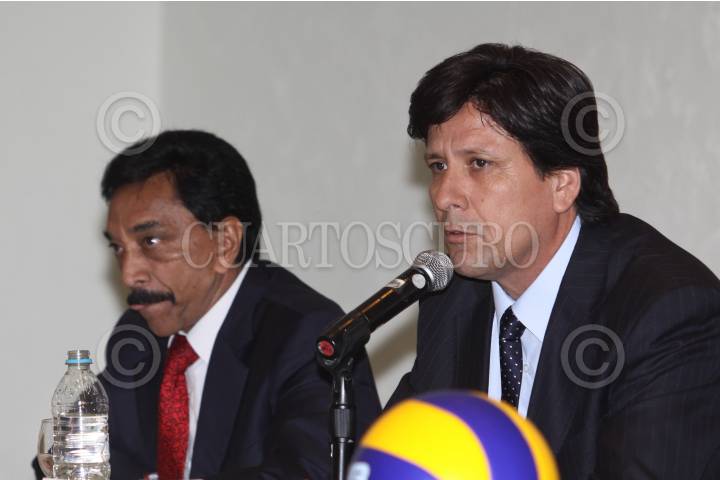 MÉXICO, D.F., 19JULIO2011.- El diputado Victor Flores y Jesus Perales Navarro, presidente de la Asociación de Voleibol de Nuevo León y director del evento; durante la presentación del evento "Copa México: Diputado Federal Víctor Flores Morales" que se realizará en la ciudad de Monterrey del 11 al 14 de agosto de 2011 y que contará con 4 equipos en la rama varonil como son Bélgica, Inglaterra, Camerún y México. FOTO: RODOLFO ANGULO/CUARTOSCURO.COM