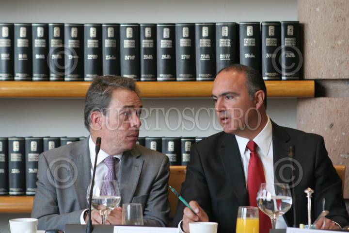 MÉXICO, D.F., 15MARZO2011.- Oscar Peralta Casares, Presidente de la Cámara Nacional de la Industria y la Transformación Querétaro, y José Calzada Rovirosa, gobernador de Queretaro, durante el desayuno en el que se presentó la "Cumbre de Negocios", que se realizará del 23 al 25 de octubre en la capital queretana. FOTO: MOISÉS PABLO/CUARTOSCURO.COM
