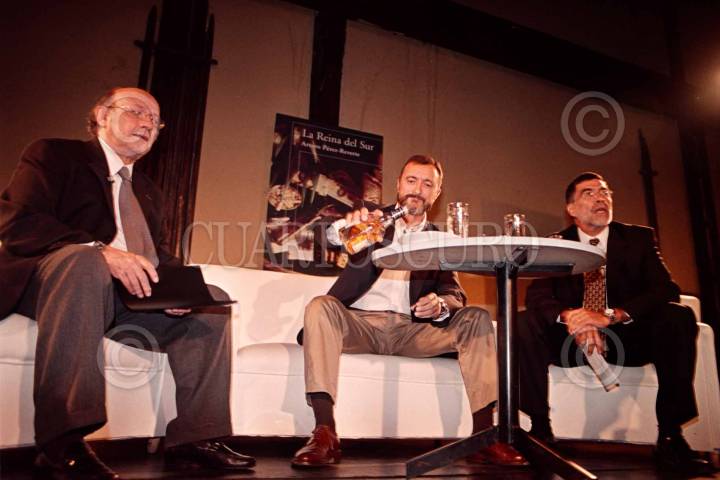 El escritor español Arturo Pérez-Reverte presentó ayer por la tarde su libro titulado "La Reina del Sur", obra donde revela los obscuros secretos del narcotráfico en México y España. En la imágen, el escritor español es acompañado de Germán Dehesa (izq) y René Delgado (der). FOTO: Susana Navrrete/CUARTOSCURO.COM