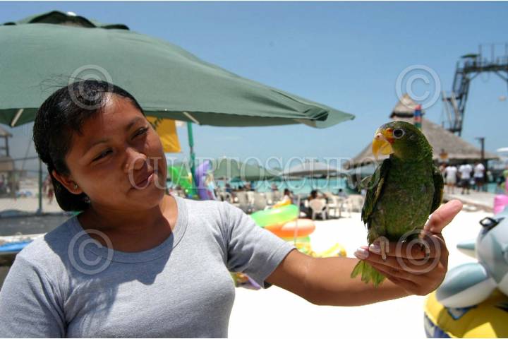 CANCUN, QUINTANA ROO 30JULIO2004.- Una turista aprovecha el calido sol del caribe para pasear a su perico. El nivel de ocupación en los hoteles no ha bajado, pese al tenso clima politico que se vive en la alcaldia. FOTO: Amaranta Prieto/CUARTOSCURO.COM