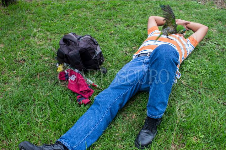 MÉXICO, D.F., 06JUNIO2015.- Un hombre toma un descanso en las áreas verdes del Bosque de Chapultepec, mientras su mascota revolotea sobre sus piernas. FOTO: DAVID POLO /CUARTOSCURO.COM