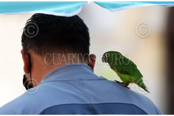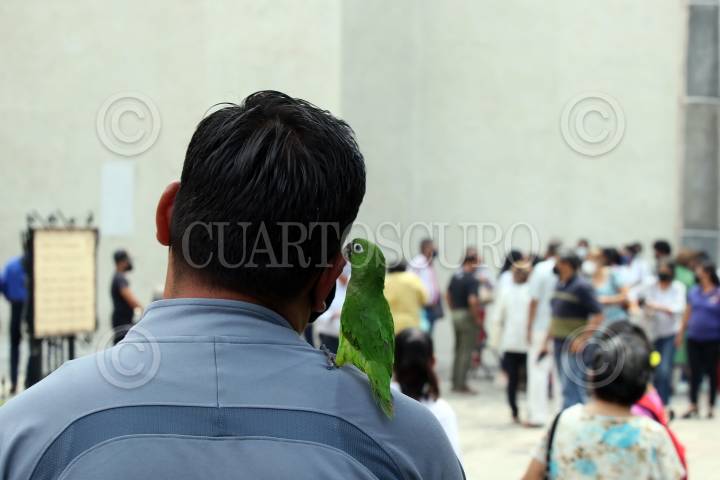 Un hombre espera en el atrio de la catedral de Cuernavaca con su mascota en el hombro, se trata de un periquito que hace travesuras en su oído.