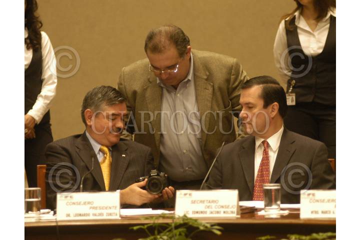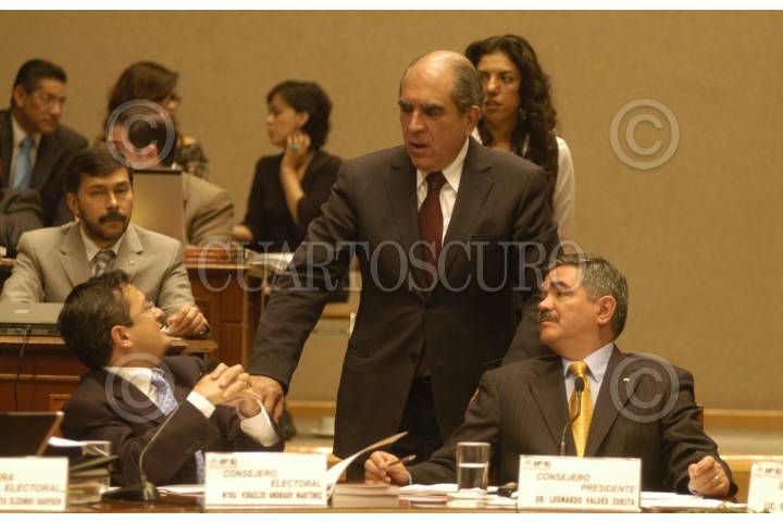 MÉXICO, D.F., 03JULIO2009.- Virgilio Andrade Martínez, consejo electoral, Pablo Gómez, senador del PRD y Leonardo Valdés, presidente del IFE, durante la sesión extraordinaria. FOTO: IVAN MENDEZ/CUARTOSCURO.COM