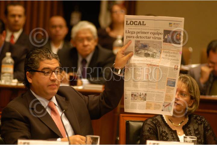 MÉXICO, D.F., 03JULIO2009.- Marco Antonio Godinez, consejero del IFE, presentó durante la sesión extraordinaria, una nota períodística del diario Reforma, donde se muestra la falsificación título de doctor PRD lo postula. FOTO: IVAN MENDEZ/CUARTOSCURO.COM