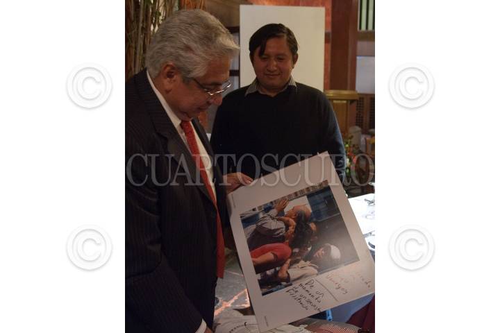 QUERÉTARO, QUERÉTARO, 19FEBRERO2011.- El fotógrafo de la Agencia Cuartoscuro Saúl López, recibió mención honorífica por la imagen "Secuestro Frustrado" en el Premio Nacional de Fotografía Periodística Plaza de Armas 2010, organizado por el periódico del mismo nombre. En la imagen Saúl López con el director del periódico Plaza de Armas Sergio Arturo Venegas Alarcón. FOTO: DEMIAN CHÁVEZ/CUARTOSCURO.COM