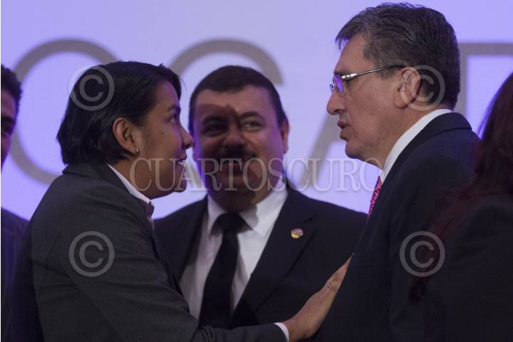 CIUDAD DE MÉXICO, 28NOVIEMBRE2016.- Mario Velázquez Miranda, consejero presidente del IEDF, y Perla Gómez, presidente de la Comisión de Derechos Humanos de la Ciudad de México, durante ceremonia en la cual Yasmín Esquivel Mossa, magistrada presidenta del Tribunal de los Contencioso Administrativo Ciudad de México, presentó su informe. FOTO: MOISÉS PABLO /CUARTOSCURO.COM