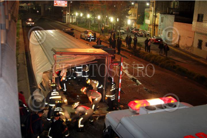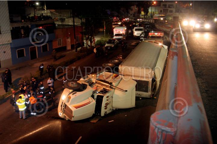 MÉXICO, D.F., 12OCTUBRE2009.- Un trailer con mas de 20 toneladas de Jugos en bolsa volco en el eje 1 Norte a la altura de la calle Fogoneros en la colonia Progresista de la delegación Venustiano Carranza. Policías Preventivos cerraron el eje 1 Norte por mas de tres horas para el trabajo de los bomberos. FOTO: LUZ ACEVEDO/CUARTOSCURO.COM