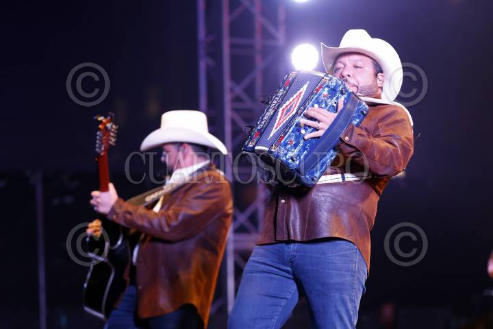 Beto Zapata, cantante principal de la banda de norteño Pesado, durante presentación en la Feria León 2020