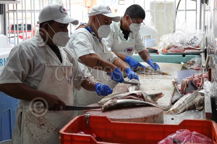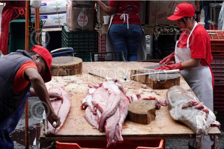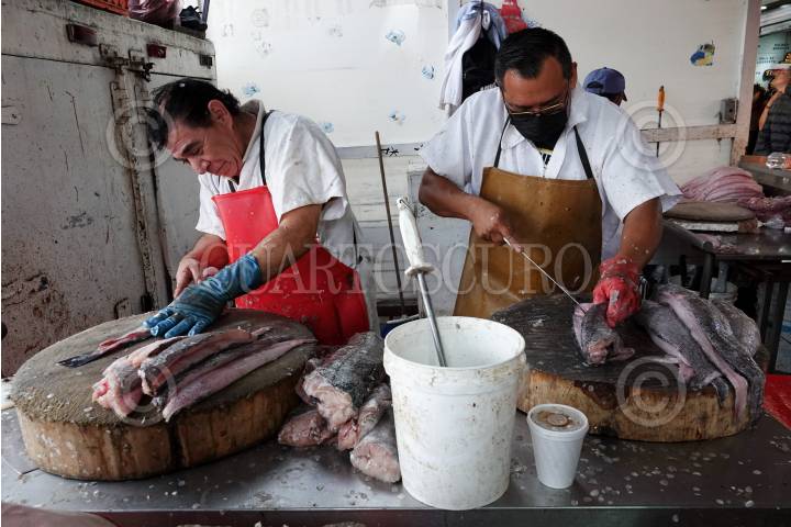 Comerciantes cortan y preparan pescados y mariscos para su venta en el Mercado de la Nueva Viga