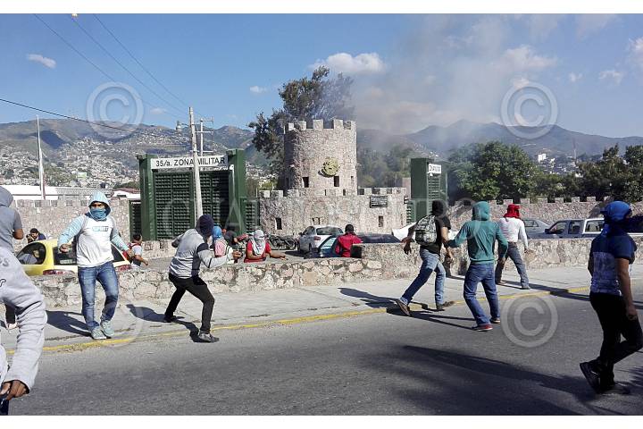CHILPANCINGO, GUERRERO, 14DICIEMBRE02016.- Normalistas y padres de los 43 estudiantes desaparecidos en Iguala se manifestaron en la caseta de Palo Blanco, en su retirada pasaron por la 35 Zona Militar, algunos de los inconformes lanzaron petardos y piedras en contra de las instalaciones castrenses. Esta movilización fue para exigir justicia por la muerte de los estudiantes Gabriel Echeverría de Jesús y Jorge Alexis Herrera Pin, asesinados en el desalojo violento de 2011 en el parador del Márquez, y la presentación con vida de los 43 desparecidos. FOTO: JOSÉ I. HERNÁNDEZ /CUARTOSCURO.COM