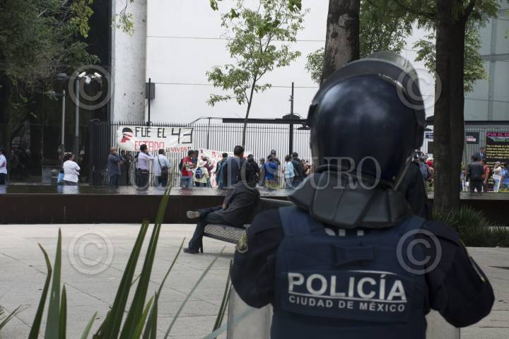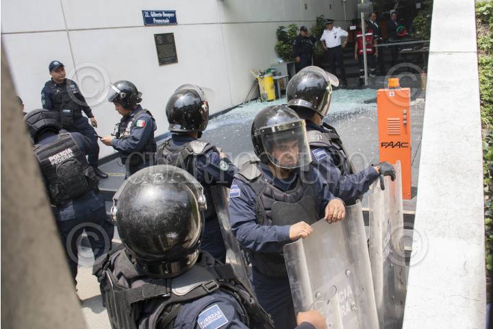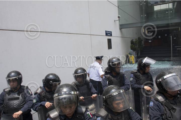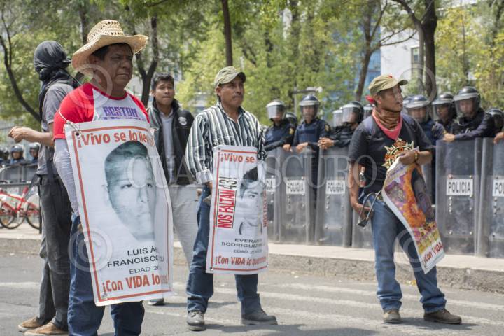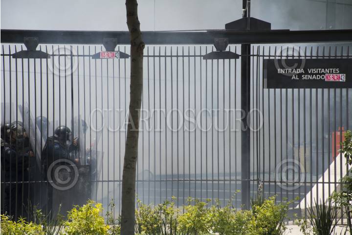 CIUDAD DE MÉXICO, 11MAYO2017.- Padres de los 43 normalistas desaparecidos en Ayotzinapa, se manifestaron afuera de las instalaciones del Senado de la República y bloquearon la avenida Reforma esquina con Insurgentes, debido a que no tuvieron respuesta por parte de las autoridades para ser recibidos para el diálogo. Por otro lado, activistas ajenos a los familiares de los normalistas, arrojaron petardos al acceso de visitantes del Senado, lo que provocó que la puerta de cristal se rompiera. FOTO: MARIO JASSO /CUARTOSCURO.COM