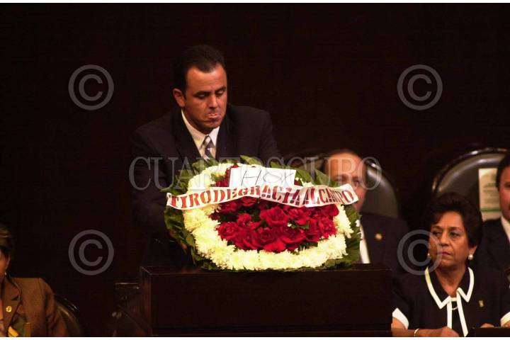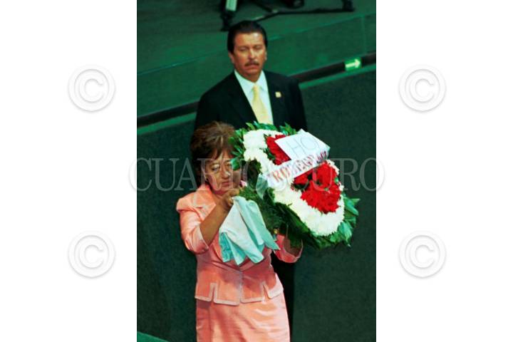Antes de abandonar el recinto legislativo junto a sus compañeros perredistas, la diputada federal Petra Santos Ortiz depositó una corona mortuoria en la tribuna de la Cámara de Diputados. Lo hizo como medida de protesta en contra del PRI y del PAN, por no haber permitido que sea un militante de su partido quien responda al segundo Informe de Gobierno. FOTO: Pedro Mera/CUARTOSCURO.COM