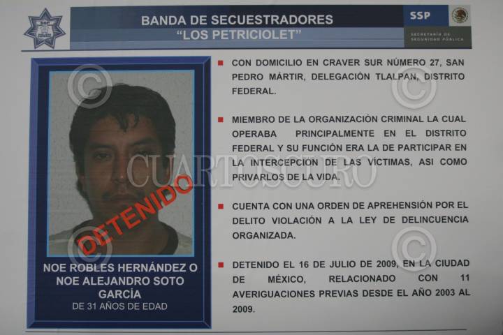 MÉXICO, D.F., 17JULIO2009.- Ficha de información de Noe Robles Hernández o Noe Alejandro Soto, presunto secuestrador de la banda de "Los Petriciolet", a quienes se les atribuyen los secuestros y homicidios de los jóvenes Fernando Martí y Antonio Equihua. Estos sujetos fueron detenidos en la delegación Xochimilco y se les atribuyen 14 secuestros mas. FOTO: GUILLERMO PEREA/CUARTOSCURO.COM