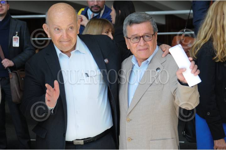 El representante del gobierno de Colombia se saluda con Pablo Beltrán, integrante del ELN.