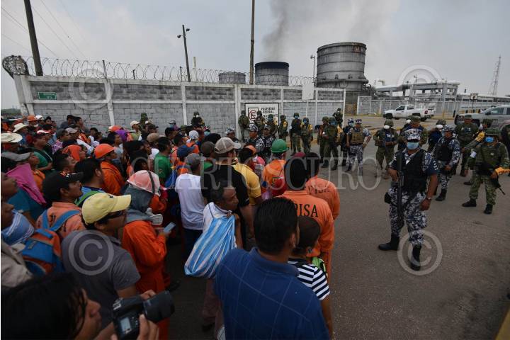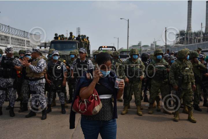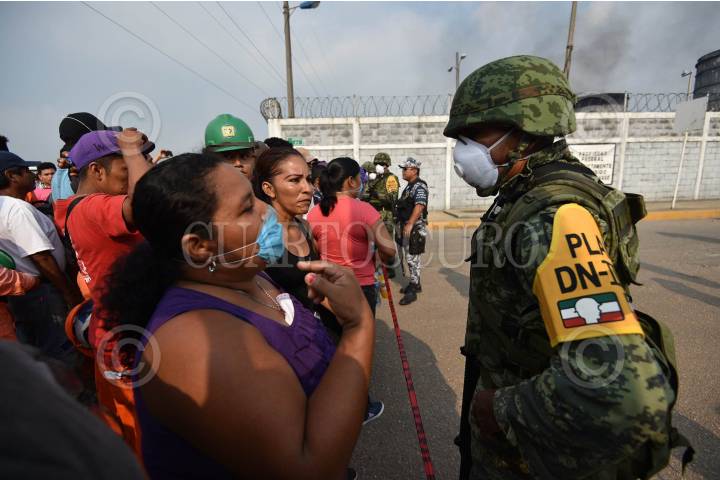 COATZACOALCOS, VERACRUZ, 21ABRIL2016.- Posterior a la explosión registrada en la petroquímica "Clorados II" en el complejo "Pajaritos" familiares de empleados que quedaron atrapados dentro de las instalaciones exigieron se les permita el acceso para reconocer los cuerpos de cada uno de sus familiares. Personal del ejercito mexicano y armada de México, resguardaron las instalaciones hasta que terminen de realizar los peritajes correspondientes. FOTO: KARLO REYES/ CUARTOSCURO.COM
