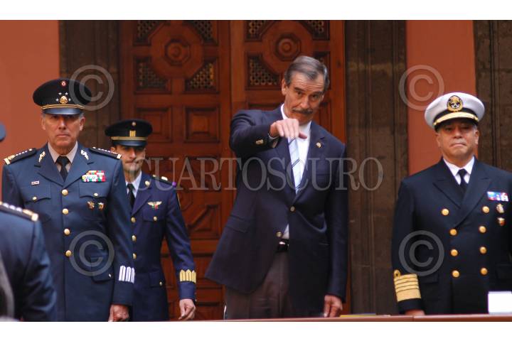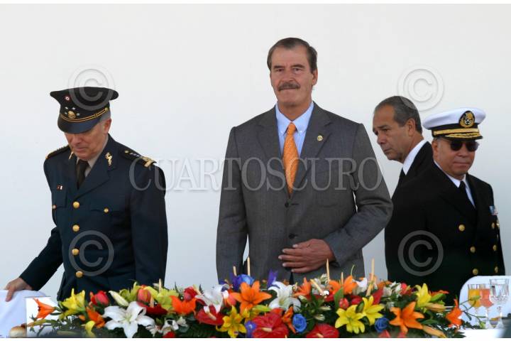 MÈXICO, D.F. 20NOVIEMBRE2005.- El secretario de la Defencas Nacional, Ricardo Clemente Vega; el presidente Vicente Fox y el Secreatrio de Marina , Marco Antonio Peyrot durante la ceremonio de entrega de condecoracoines a elementos de la armada de Mèxico. FOTO: Miriam Sánchez/CUARTOSCURO.COM