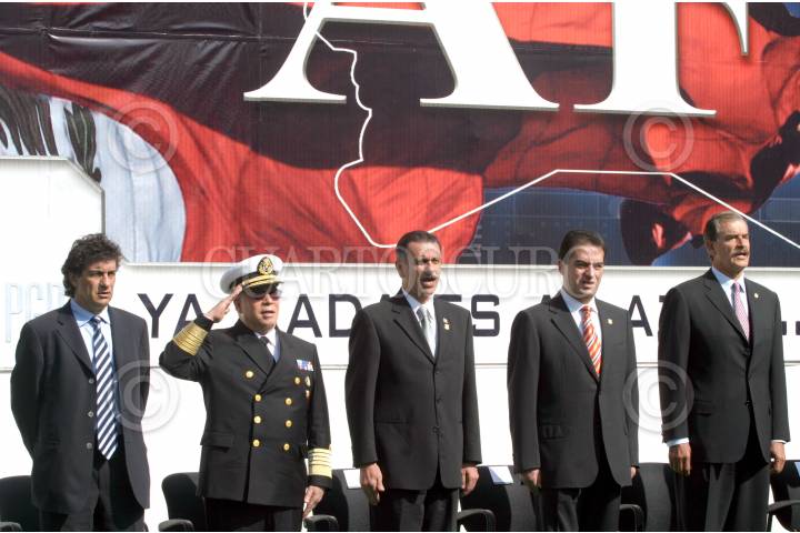 MEXICO, D.F., 22NOVIEMBRE2005.- Rubén Omar Romano entrenador de club Cruz Azul, el Secretario de Marina, Marco Antonio Peyrot, el Secretario de Gobernación Carlos Abascal, el Procurador General de República Daniel cabeza de Vaca y Vicente Fox Quesada, Presidente de la República durante la ceremonia del cuarto aniversario de la creación de la Agencia Federal de Investigación FOTO: Leonardo Casas/CUARTOSCURO.COM