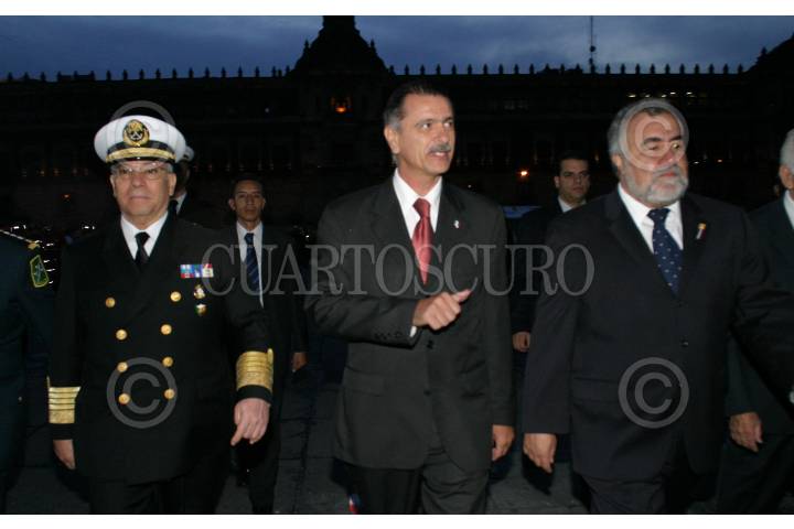 MÉXICO, D.F. 19SEPTIEMBRE2006.- Marco Antonio Peyrot González, Secretario de Marina de México, Carlos Abascal Carranza, Secretario de Gobernación, Alejandro Encinas Rodríguez, Jefe de Gobierno del Distrito Federal, durante la ceremonia con motivo del Día Nacional de la Protección Civil a 21 años de los sismos de 1958. FOTO: NELLY SALAS/CUARTOSCURO.COM