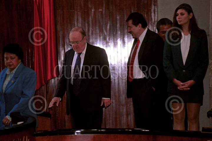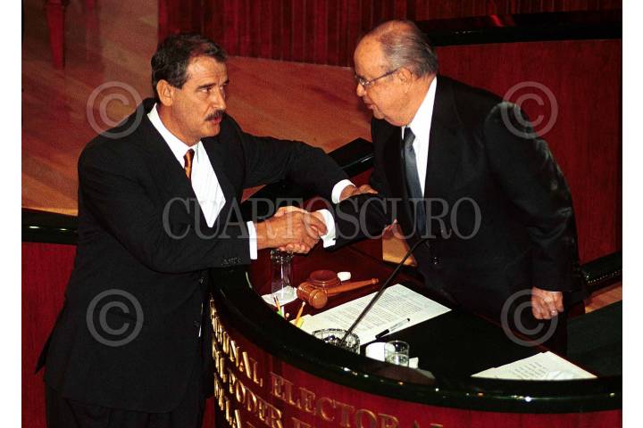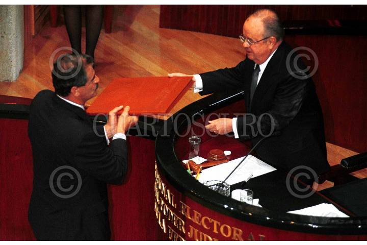 Vicente Fox recibe su constancia como presidente electo de manos del presidente del Tribunal Federal Electoral; magistrado Jose Luis de la Peza. FOTO: Pedro Mera/CUARTOSCURO.COM