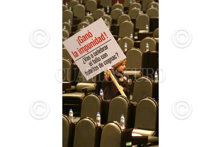 MÉXICO D.F. 04DICIEMBRE2007.-Diputado del Partido Nueva Alianza, muestran unas pancartas con diversas leyendas, esto por fallo de la Suprema Corte de Justicia en el caso de la periodista Lydia Cacho.En la imagen la diputa Irma Piñeiro. FOTO:GUILLERMO PEREA/CUARTOSCURO.COM