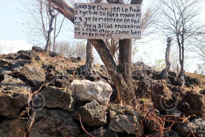 Un mensaje advierte que quien robe piedra tendrá problemas, en un terreno en la Reserva Estatal del Texcal.
