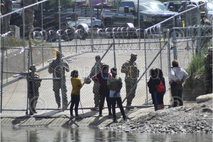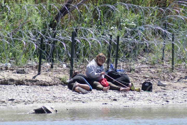 PIEDRAS NEGRAS, COAHUILA, 21MARZO2024.- Un grupo de quedaron varados en el embarcadero de embarcadero de Shelby Park, sin embargo los militares estadounidenses que custodian la alambrada en Eagle Pass no los dejaron pasar, al contrario de forma irónica con altavoz les dicen en español que si quieren agua, trabajo o ayuda lo pidan en México y no en su país. Desde lado mexicano se observa a las personas que no pudieron ingresas a los Estados Unidos sentadas junto a la alambrada em espera de poder ingresar. FOTO: CUARTOSCURO.COM