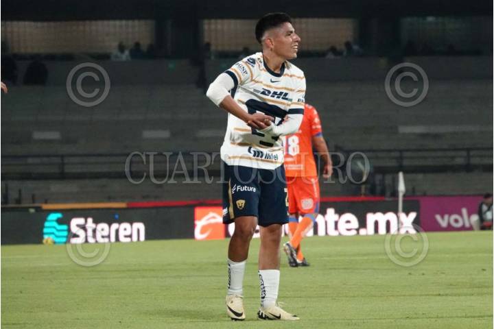 CIUDAD DE MÉXICO, 05NOVIEMBRE2024. Festejo del jugador Piero Quispe durante el partido de fútbol Pumas vs Querétaro correspondiente a la jornada 16 del Torneo Apertura 2024 de Liga BBVA MX, en el Estadio Olímpico Universitario. FOTO: EDGAR NEGRETE LIRA/CUARTOSCURO.COM