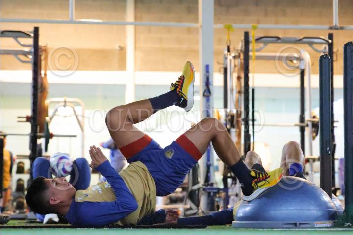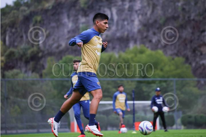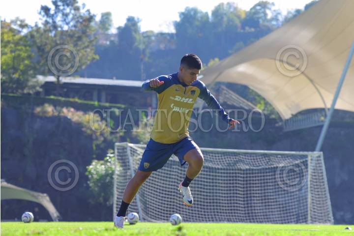CIUDAD DE MÉXICO, 28DICIEMBRE2023.- El primer refuerzo de Pumas para este Clausura 2024, Piero Quispe, ya entrenó bajo las órdenes de Gustavo Lema, director técnico del primer equipo. Luego de oficializarse su llegada al cuadro universitario, el jugador peruano se integró a los trabajos de pretemporada que ya realiza el plantel en Cantera. FOTO: PRENSA PUMAS/CUARTOSCURO.COM