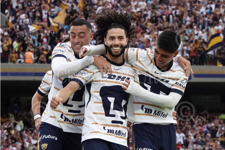 CIUDAD DE MÉXICO, 21JULUO2024.- Los jugadores Rogelio Funes Mori, César Huerta y Piero Quispe celebraron un gol anotado durante el partido contra Pachuca en la Jornada 4 Apertura 2024 de la Liga BBVA, realizado en el Estadio Olímpico Universitario. FOTO: GRACIELA LÓPEZ /CUARTOSCURO.COM