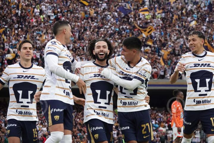CIUDAD DE MÉXICO, 09FEBRERO2025.- Jugadores de Pumas celebraron el gol anotado por el centro campista Piero Quispe contra el equipo de Mazatlán durante la Jornada 6 de la Clausura 2025 en el Estadio Olímpico Universitario. FOTO: GRACIELA LÓPEZ/CUARTOSCURO.COM