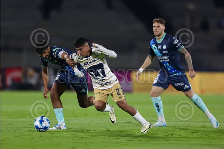 CIUDAD DE MÉXICO, 17SEPTIEMBRE2024. Pablo González de La Franja disputa una pelota a Piero Quispe de Pumas durante el partido de fútbol Pumas vs Puebla correspondiente a la jornada 8 del Torneo Apertura 2024 de Liga BBVA MX, en el Estadio Olímpico Universitario. FOTO: EDGAR NEGRETE LIRA/CUARTOSCURO.COM