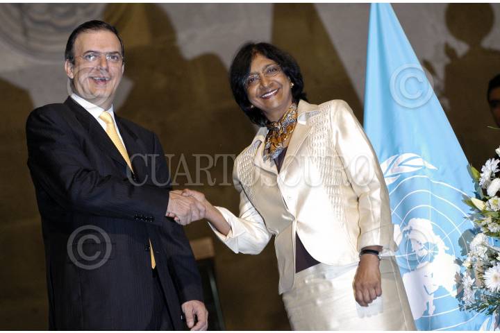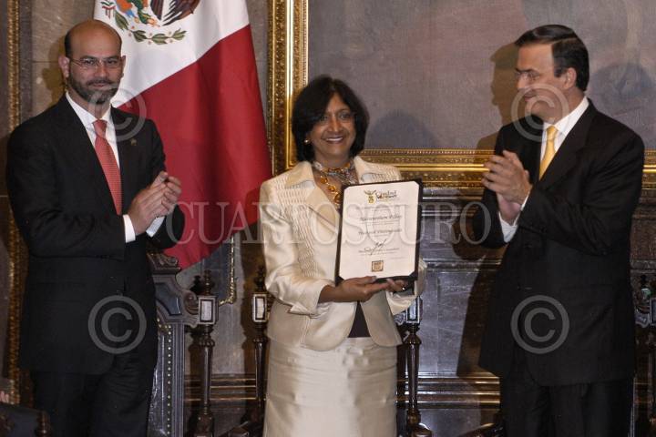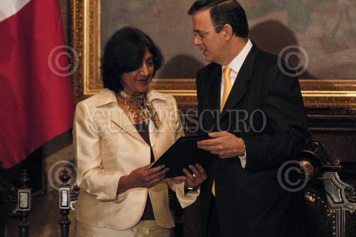 MÉXICO, D.F., 08JULIO2011.- Marcelo Ebrard Casaubon, jefe de Gobierno del Distrito Federal, entregó el Diploma de Huésped Distinguido a Navanethem Pillay, Alta Comisionada de Naciones Unidas para los Derechos Humanos. Ésto se realizó en el Antiguo Palacio del Ayuntamiento. FOTO: MISAEL VALTIERRA/CUARTOSCURO.COM