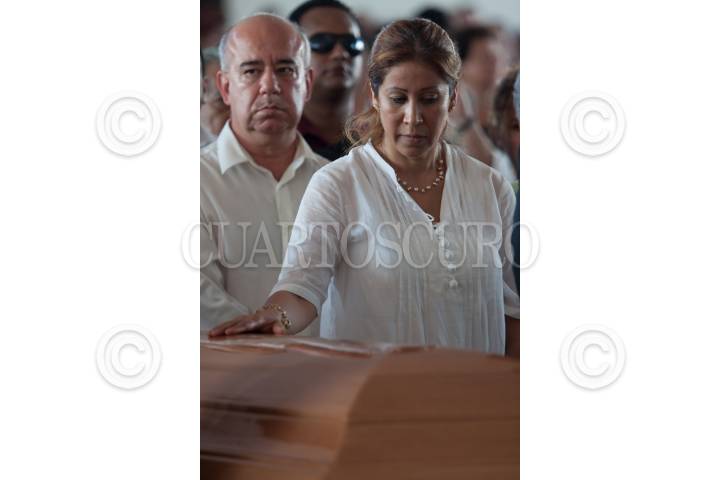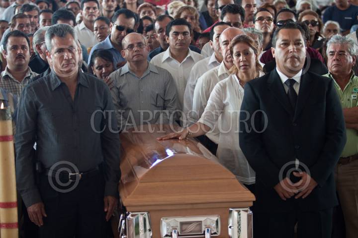 TECOMAN, COLIMA, 22NOVIEMBRE2010.- Idalia González Pimentel, viuda de Cavazos observa el féretro de su esposo Silverio Cavazos Ceballos (1968-2010) durante la guardia de honor en la misa al ex mandatario que se ofreció en el Templo de Santo Santiago Apóstol ubicado en este municipio. El ex gobernador fue asesinado el día de ayer por tres disparos de arma de fuego afuera de su casa. FOTO: MISAEL VALTIERRA/CUARTOSCURO.COM