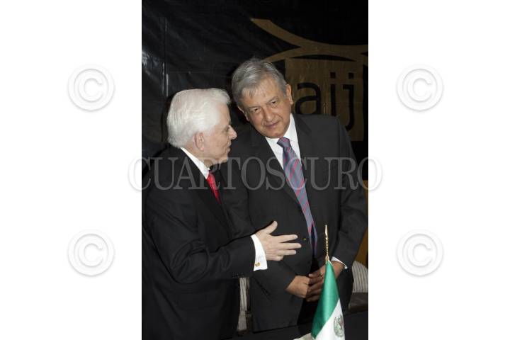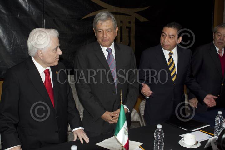MÉXICO, D.F., 06DICIEMBRE2011.- Génaro Gongora Pimentel, ministro retirado de la Suprema Corte de Justicia de la Nacional, y Andrés Manuel López Obrador, aspirante a la Presidencia de la República por la corriente de izquierda, en el foro “Por México y para México", la cual se desarrolló en el Club de Banqueros. FOTO: MOISÉS PABLO/CUARTOSCURO.COM