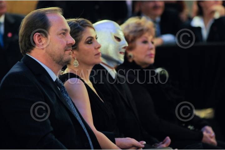 MÉXICO, D.F., 12AGOSTO2011.- Mario Moreno Ivanova, hijo de Mario Moreno Cantinflas, Laura Esthela, pareja de Mario Moreno Ivanova, el hijo del Santo y la actriz Silvia Pinal escucharon el discurso de Margarita Zavala, esposa del Presidente Felipe Calderón que pronunció con motivo de los 100 años del nacimiento del mimo mexicano y que se celebró con la cancelación del timbre postal realizado en el edificio de Correos la tarde de hoy. FOTO: FRANCISCO RODRÍGUEZ/CUARTOSCURO
