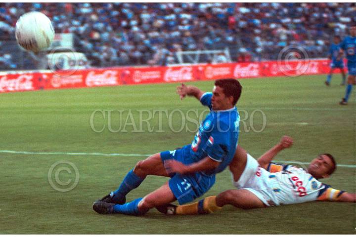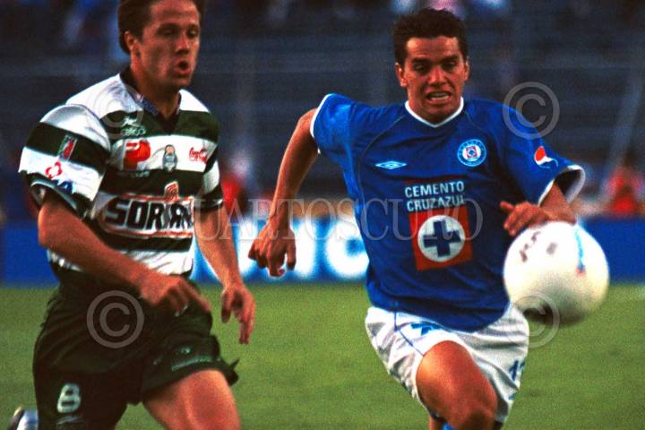 La "máquina celeste" de Cruz Azul empató 2-2 con el Santos Laguna en partido de la fecha seis del Campeonato Clausura 2003 disputado en el Estadio Azul. El conjunto celeste suma su sexto juego sin ganar en el presente torneo, llegó a cinco puntos, mientras los laguneros ya tienen ocho dentro del sector cuatro. FOTO: Juan Pablo Zamora/CUARTOSCURO.COM