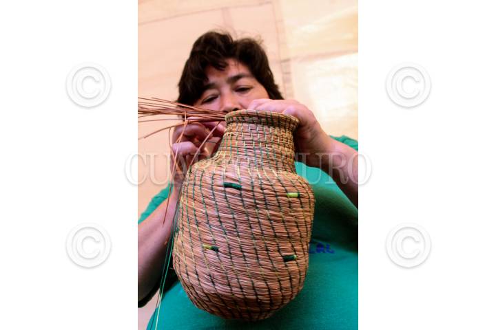 HUITZILAC, MORELOS, 04SEPTIEMBRE2015.- Doña Rosa trabaja en compañía de un grupo de mujeres de su comunidad en la elaboración de artesanías hechas con hojas de pino, mejor conocidas como ocoxal; además de ser un manera de ganarse la vida, para muchas mujeres es una actividad que impulsa la conservación sustentable de los recursos naturales locales. Llaveros, floreros, fruteros, tortilleros, pulseras y aretes son algunos de los productos que se elaboran con este material. Tres años es el tiempo que lleva dedicándose a esta actividad como un medio de sustento; su trabajo consiste en la recolección de las hojas en el bosque, después se almacenan en un lugar libre de humedad, y finalmente se tejen las hojas de acuerdo al tamaño y forma de la pieza que se elige fabricar. FOTO: PATRICIA MORALES/ CUARTOSCURO.COM