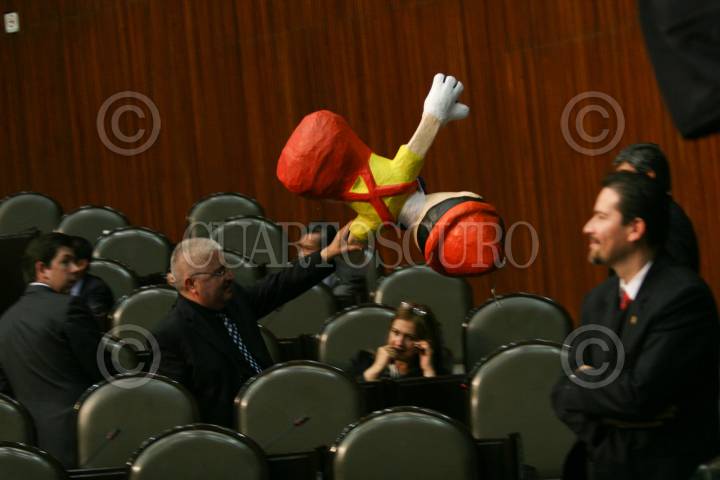MÉXICO D.F., 09MARZO2010.- María Estela de la Fuente, Diputada del PRI, coloco una piñata con la figura de pincho equivocadamente detrás de Francisco Rojas coordinador de esta bancada y de Beatriz Paredes Rangel, presidenta nacional del PRI, ya que sería colocada en el lugar del diputado y dirigente del PAN, César Nava, esto cuando debatía sobre el convenio que se firmo entre los dirigentes del PRI y del PAN. Camilo Ramírez Puentes, Diputado del PAN, saca la piñata de pinocho del salón de plenos. FOTO: GUILLERMO PEREA/CUARTOSCURO.COM