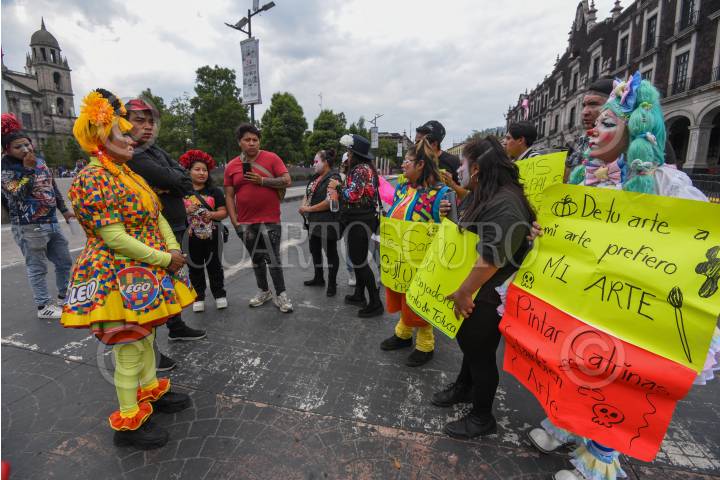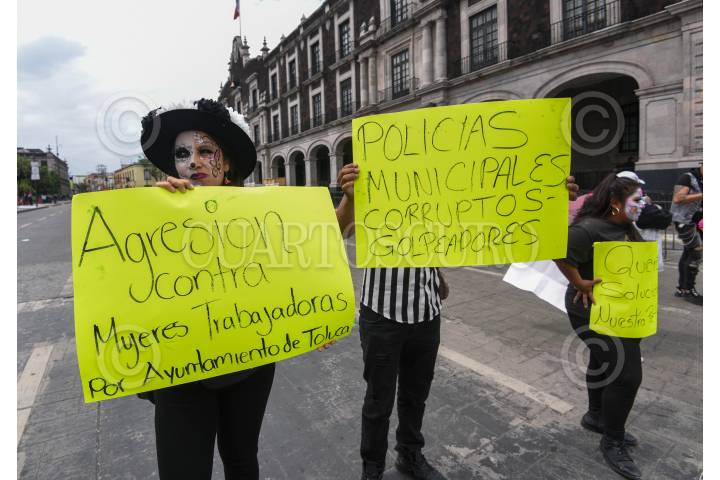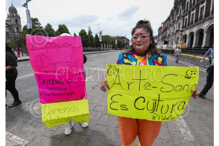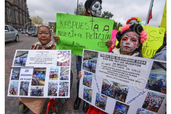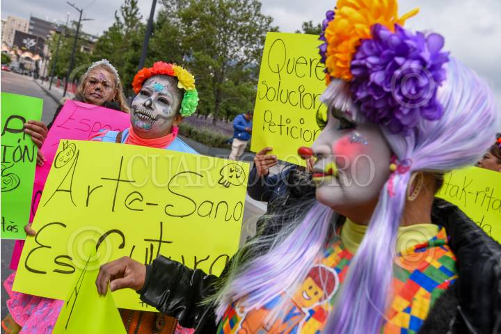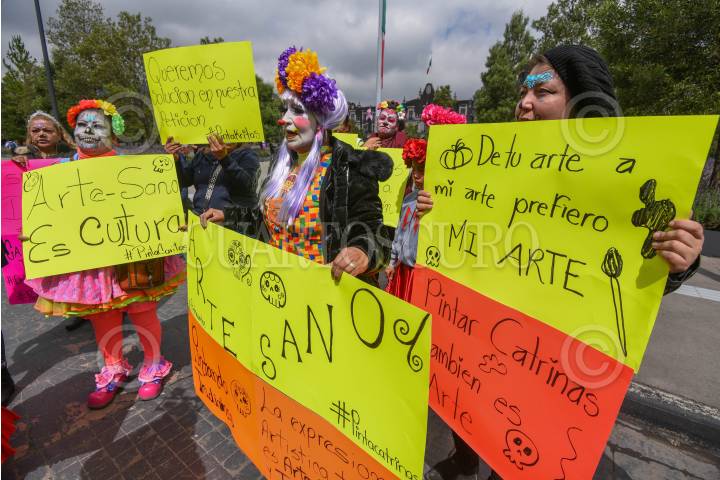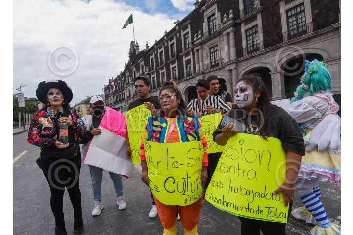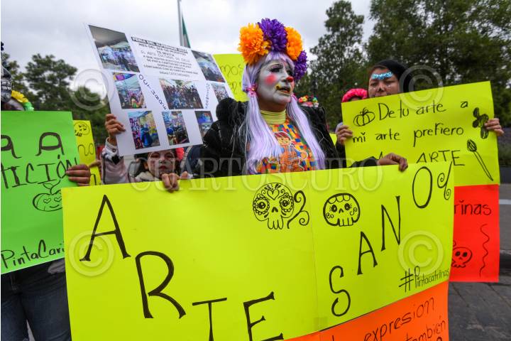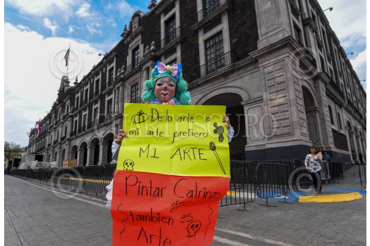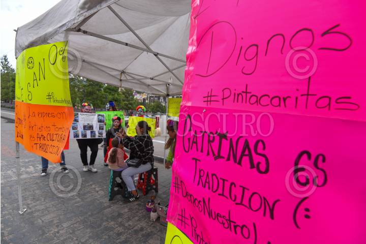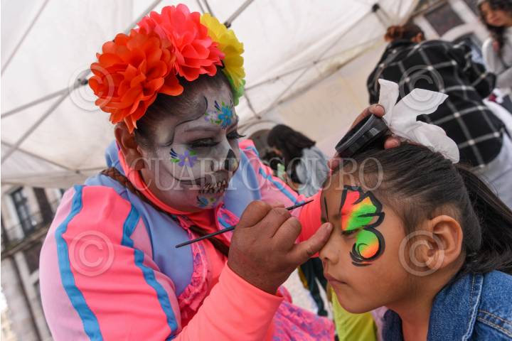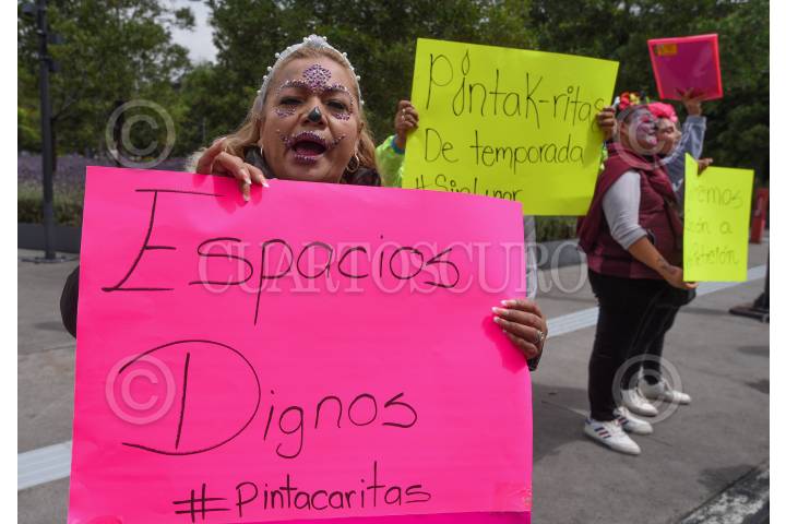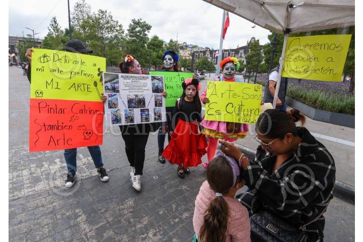 TOLUCA, ESTADO DE MÉXICO, 08OCTUBRE2023.- Pintacaritas se manifestaron en el ayuntamiento de Toluca pidiendo los dejen instalarse durante los festejos del Día de Muertos en la Feria del Alfeñique, ya que es una de las épocas en que tienen más trabajo, dieron maquillaje gratis a los niños que pasaron por el lugar. FOTO: CRISANTA ESPINOSA AGUILAR /CUARTOSCURO.COM