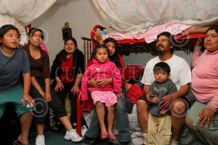 OXNARD, CALIFORNIA. E.UA.- 29 de Mayo de 2006.- La familia Parra, inmigrantes purepechas de Michoacan, viven y duermen en una habitancion que comparten en Oxnard, también la familia Parra se dedica a la pisca de fresas. Rafael, el padre la madre Hilda, los niños Cecilia, Rosa, Luz, Pedro, Princesa y Guadalupe Parra, conforman este hogar. FOTO: David Bacon/CUARTOSCURO.COM
