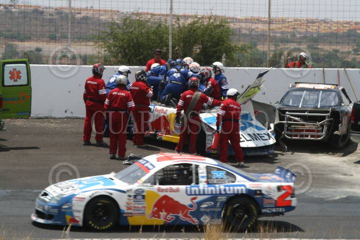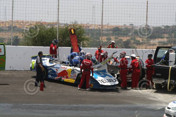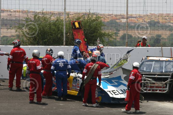 GUADALAJARA, JALISCO 18MAYO2008.- Antonio Pérez de la escuderia Telmex con el automóvil número 4 se accidentó causando que lo sacaran en camilla de la pista. FOTO: SASHENKA GUTIERREZ/CUARTOSCURO.COM