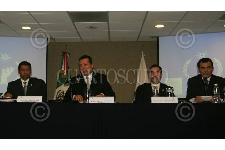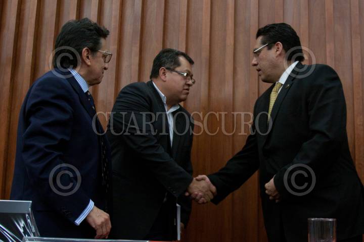 MÉXICO, D.F., 16JUNIO2010.- Marat Paredes Montiel, Segundo Visitador General, junto a Raul Placencia Villanueva, Presidente de la Comisión Nacional de los Derechos Humanos; Luis García Lopez Guerrero, Primer Visitador General y Arturo Zárate, Coordinador General de Comunicación durante la conferencia que realizaron ante los medios de comunicación para dar un informe y recomendaciones en el caso de los menores Martín y Bryan Almanza Salazar quienes murieron el pasado mes de Abril en una balacera entre elementos del ejercito mexicano y la delincuencia organizada. El Ombudsman Nacional, menciono que su muerte se debió a causa de los disparos del ejercito mexicano. FOTO: ENRIQUE ORDÓÑEZ/CUARTOSCURO.COM